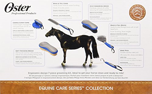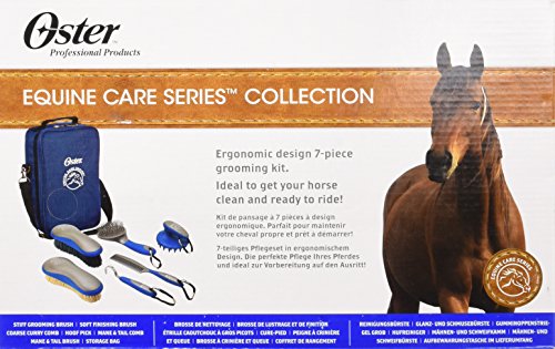 Oster(R) Equine Care Series 7-Piece Grooming Kits These complete grooming kits contain everything you need for fast and easy grooming, in your choice of blue or pink with matching case and handles. These ergonomic grooming tools enable grooming comfort, while the convenient and durable storage cases keep everything neat and organized. Both store easily, whether trailering or in your tack trunk. Each kit color is slightly different and details are listed below. However, both colors may not be available. Blue Kit Contents: Stiff grooming brush Mane and tail brush Mane and tail comb Hoof pick Coarse curry comb Soft grooming brush Zip Closing case/13″ W x 4″ D x 9.5″ H Pink Kit Contents: Stiff grooming brush Mane and tail brush Mane and tail comb Hoof pick Round fine curry comb Round face grooming brush Plastic buckle front flap closing case/13″ W x 4″ D x 9.5″ H.