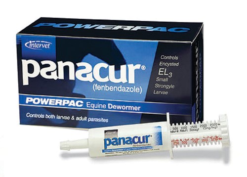 Panacur (fenbendazole) Paste 10% is indicated for the control of large strongyles (Strongylus edentatus, S. equinus, S. vulgaris), encysted early third stage (hypobiotic), late third stage and fourth stage cyathostome larvae, small strongyles, pinworms (Oxyuris equi), ascarids (Parascaris equorum), and arteritis caused by fourth stage larvae of Strongylus vulgaris in horses. Panacur (fenbendazole) POWERPAC has no known contraindications with any drugs. Features: Proven Safe ? Safe for foals and pregnant mares, older horses, thin and underweight horses, miniature horses, the environment and for use around other farm animals and pets.; Works on a wide variety of parasites ? Labeled for the control of large and small strongyles (including migrating larvae), pinworms and ascarids (roundworms).; Effective on encysted small strongyles ? A larvicidal dose is the only FDA-approved treatment for all stages of encysted small strongyles.; Reliable protection for foals ? Widely recognized as the product of choice for treating ascarids in young horses.; Combat resistance ? May be effective even in the face of prior fenbendazole resistance when used as part of a strategically designed anthelmintic program.; Unique Mode of Action ? The antiparasitic action of Panacur (fenbendazole) POWERPAC is due to the inhibition of energy metabolism in the parasite. Administration – DOSE: Panacur (fenbendazole) Paste 10% is administered orally at a rate of 2.3 mg/lb (5 mg/kg) for the control of large strongyles, small strongyles, and pinworms. One syringe will deworm two 1,250 lb horses. For foals and weanlings (less than 18 months of age) where ascarids are a common problem, the recommended dose is 4.6 mg/lb (10 mg/kg); one syringe will deworm one 1,250 lb horse. For control of encysted early third stage (hypobiotic), late third stage and fourth stage cyathostome larvae, and fourth stage larvae of Strongylus vulgaris, the recommended dose is.