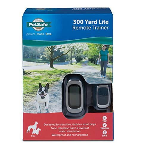 Train your dog with the press of a button with the PetSafe 300 Yard Remote Trainer. This rechargeable waterproof system was designed for dogs that might need a milder static stimulation than one of our standard systems. It comes with three different types of stimulation: tone vibration and 1-15 levels of static stimulation (with safety lock feature for 8-15). The backlit digital remote is easy to read and features a convenient two button design with dedicated buttons for tone and stimulation. This makes it easy to use as a vibration or tone trainer. It is lightweight and ergonomically designed to fit dogs 8 lb. and up with neck sizes up to 28in. Train up to two dogs at once with the purchase of additional collars; PetSafe Add-A-Dog Lite Receiver Collar PAC00-16163 or Add-A-Dog Receiver Collar PAC00-16164.