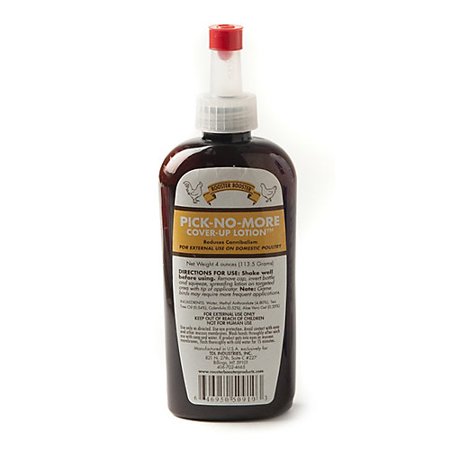 Rooster Booster Pick-No-More Lotion This proven peck control product reduces cannibalism in poultry. It comes in a convenient squeeze tip bottle with applicator tip. Item Specifications: Size: 4 oz. bottle Directions for Use: Shake well before using. Remove cap invert bottle and squeeze spreading lotion on targeted area with tip of applicator. Note: Game birds may require more frequent applications. Ingredients: Water Methyl Anthranilate (4.80%) Tea Tree Oil (0.54%) Calendula (0.52%) Aloe Vera Gel (0.35%) Warnings: For external use only. Keep out of reach of children. Not for human use. Use only as directed. Use eye protection. Avoid contact with eyes and other mucous membranes. Wash hands throughly after each use with soap and water. If product gets into eyes or mucuous membranes flush throughly with cold water for 15 minutes.