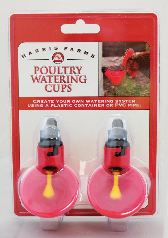 Harris Farms Poultry Drinker Waterer Cup 2 pack for Chickens are Easy-to-install watering cups deliver a constant supply of fresh water from either a plastic container or PVC water source. Nipple stem releases water automatically when chickens hit it These watering cups should be used only with a gravity-flow system and never connected to a pressurized water supply.