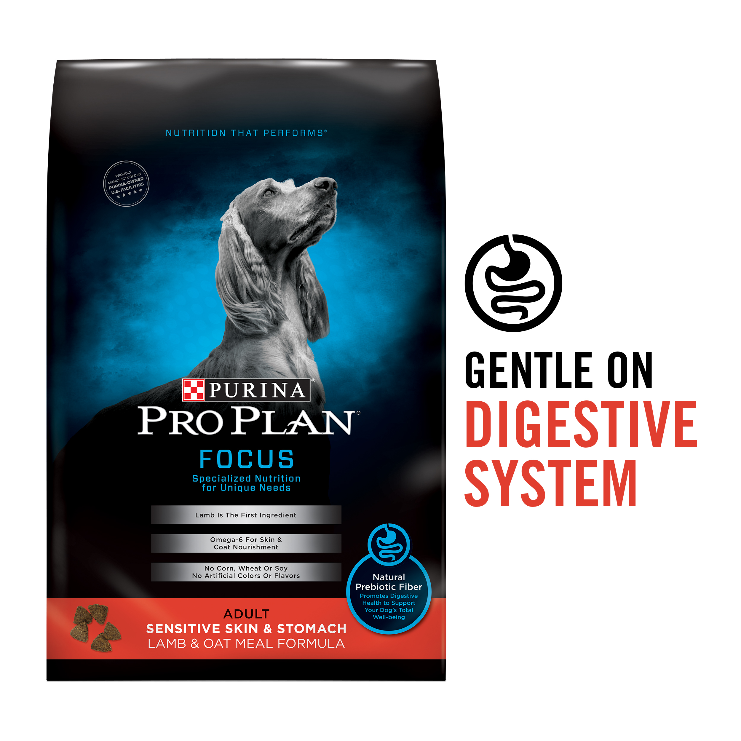 Keep your dog s sensitive skin and stomach protected while meeting his nutritional needs with Purina Pro Plan Sensitive Skin and Stomach Dog Food Lamb and Oat Meal Formula dry dog food. A high-quality adult dog food for sensitive stomachs this recipe is made with lamb as the number one ingredient complemented with easily digestible oat meal. To give your canine companion the nutritious ingredients you expect from a premium dog food omega-6 fatty acids and vitamin A nourish your dog s skin and lustrous coat so he can look his very best. Meanwhile prebiotic fiber in every serving of this dog kibble nourishes the beneficial bacteria within your dog’s intestines to promote healthy digestion. This high protein dog food also has fish oil for dogs featuring omega-3 fatty acids for healthy joints and mobility plus a healthy dose of EPA and DHA for heart health help to support his active lifestyle. This dog food for sensitive stomach and skin does not include artificial colors flavors or poultry by-product meal only what your faithful canine needs to be their best. Introduce your dog to a premium dog food for sensitive stomach and skin by serving them Purina Pro Plan Sensitive Skin and Stomach Dog Food Lamb and Oat Meal Formula dry dog food.