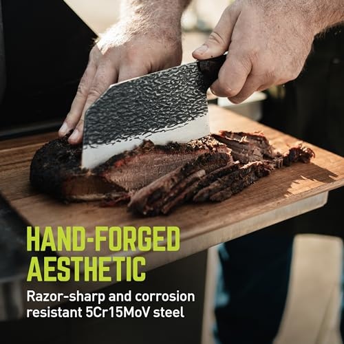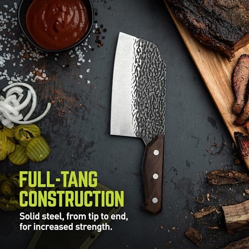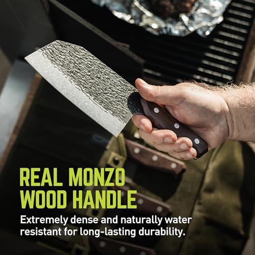 TRUE’s PrimalForgeĀ® knives are inspired by blacksmith craftsmanship so they have an artisanal, hand-forged aesthetic without the high expense and maintenance of a custom knife. The forged styling and tumbled stonewash finish add to the rustic design and will mask wear and tear over time. The hefty, yet ergonomic handle feels great in your hand and is made of Monzo wood which is known for its dense hardness and water-resistant properties. The sturdy, stainless-steel blade holds a sharp edge and is built with full tang construction to ensure long-lasting durability. A custom sheath is included to protect the knife when you need to pack or store it. Start taking your game to the next level with the perfect grilling cutlery. The PrimalForge chopper is a hefty design for easily chopping through bones and joints like a cleaver while still being a manageable size that is great for slicing and dicing tasks thanks to its slightly curved edge. The PrimalForge⢠chopper knife has a hefty build with a slight rocker to the 6.5 In. cutting edge making it a crossover chef / butcher knife for multipurpose cutting, chopping, slicing, and dicing of herbs, vegetables, and fruits as well as cutting down larger cuts of meat.