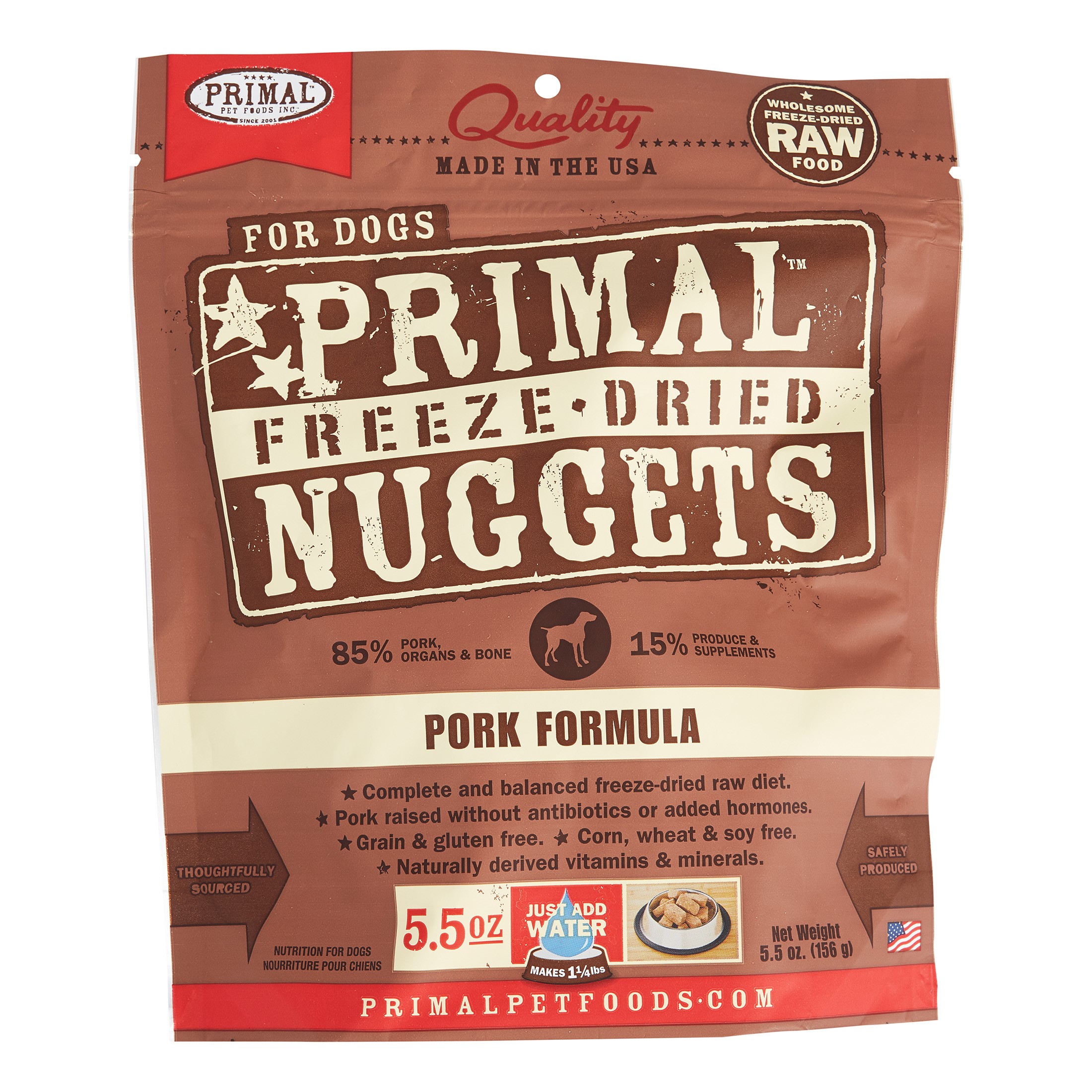 Primal Pet Foods Nuggets Grain-Free Pork Formula Freeze Dried Dog Food Since 2001 San Francisco-based Primal Pet Foods has made wholesome raw foods for cats and dogs from human-grade organic ingredients free of grains or gluten. Keeping your pet s diet as close to nature as possible Primal offers nutrient-dense highly digestible recipes. Primal Dry Roasted Chicken Shredders are made from USA-raised chicken without antibiotics or added hormones. These crispy protein-rich snacks are perfect treats or training rewards.Ingredients: Pork Hearts Pork Livers Ground Pork Bones Organic Collard Greens Organic Squash Organic Green Beans Cranberries Blueberries Organic Pumpkin Seeds Organic Sunflower Seeds Montmorillonite Clay Organic Apple Cider Vinegar Organic Cilantro Organic Ginger Sardine Oil Alfalfa Dried Organic Kelp Organic Quinoa Sprout Powder Organic Coconut Oil Vitamin E Supplement Mixed Tocopherols (natural preservative).Guaranteed Analysis: Crude Protein (min) 39% Crude Fat (min) 22% Crude Fiber (max) 1% Moisture (max) 3% Ash (max) 6.5%.