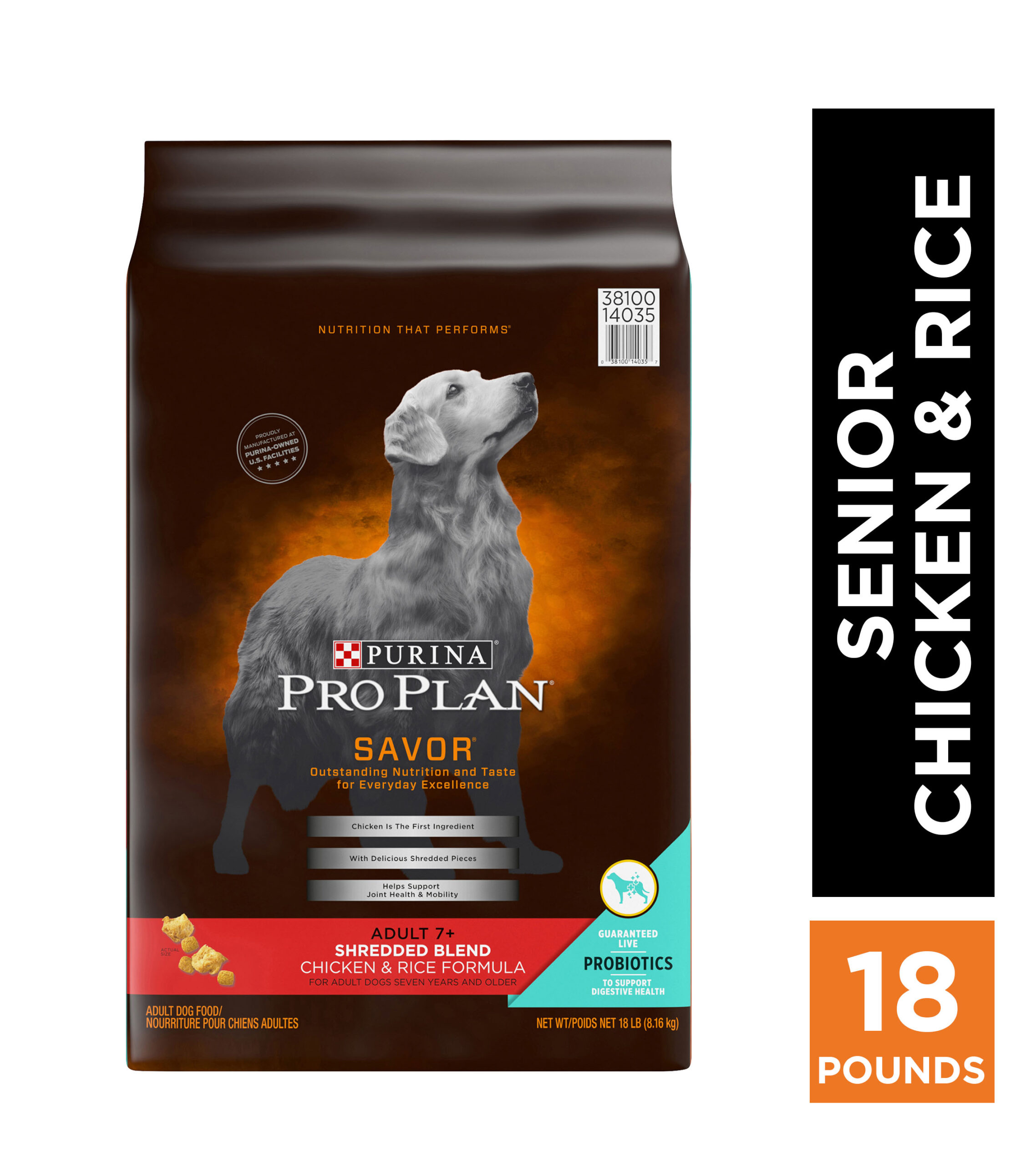 Purina Pro Plan Savor Adult 7+ Shredded Blend Chicken & Rice Formula Dry Dog Food, 18-lb bag; Purina Pro Plan is designed to help your dog be his absolute best. They formulate their food with real meat, poultry, or fish to increase bioavailability.