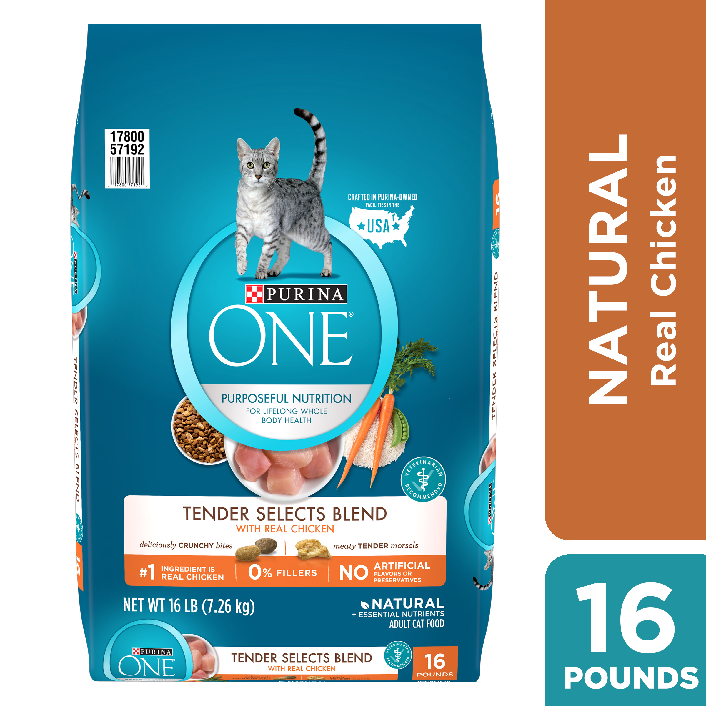 Purina One Tender Selects Blend Dry Kitten Food Chicken Serve your cat a plate of the deliciously crunchy bites and meaty morsels she craves with Purina ONE Tender Selects Blend With Real Chicken adult dry cat food. This natural recipe plus essential nutrients uses real chicken as the #1 ingredient to help give your cat the protein she needs to support her strong muscles. We craft this cat food without fillers artificial flavors or preservatives using real ingredients including accents of real carrots and peas.