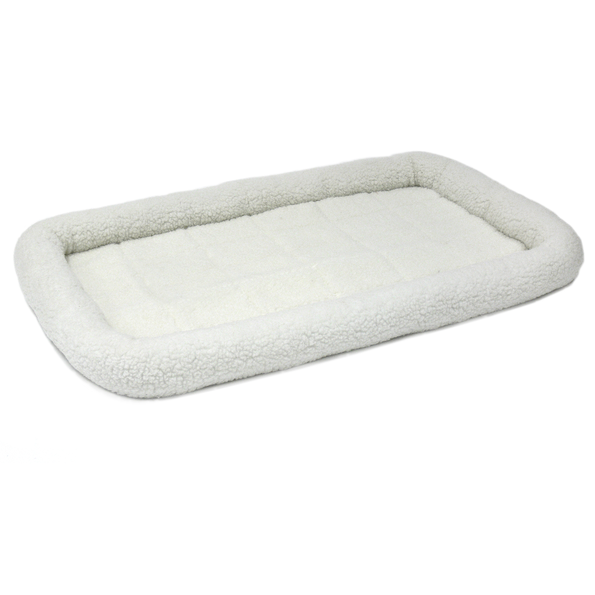 MidWest Homes for Pets is proud to offer the QuietTime Bolster Fleece Pet Beds to provide your dog or cat with a soft cozy & welcoming place to rest & relax. These comfortably padded pet beds are ideal for most standard folding metal dog crates dog carriers cat carriers dog houses and work great as a stand-alone dog bed / cat bed anywhere in the house or when traveling with your pet. Each fleece pet bed is made of polyester with overstuffed bolsters around the perimeter creating a nice headrest adding to your dog or cats overall comfort. This fleece pet bed features a rectangular shape and is sized to fit most standard 48 long dog crates. Since these pet beds are machine washable / dryer friendly they are easy to care for and built to last. The white fleece cream color helps conceal shedding & compliments any home décor. MidWest Homes for Pets stands behind the quality of our products with a 1-Year Manufacturer s Warranty. If you have any questions regarding our dog beds or cat beds our customer service department would be glad to help you. MidWest customer service can be contacted at: 1-800-428-8560 available 9:00 AM – 4:00 PM Monday – Friday EST.