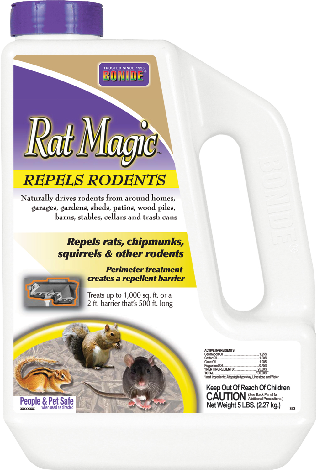 BONIDE Rat Magic granules repel rats chipmunks and squirrels from outdoor areas like garages sheds basements and more. Made with natural ingredients. Rat magic is people & pet safe when used as directed.