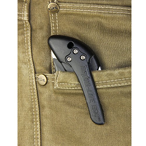 This is the sharpest strongest replacement razor-blade knife available with blades that change safely and easily at the push of a button. The black-oxide coated blade holder supports the razor-blade for the strength of a standard knife and sharpness of a surgeon s scalpel. The 3.5 Japanese 420J2 stainless razor-blades are precisely heat treated and hand finished shaving-sharp. The double molded Grivory handle features rubberized TPR inserts for a non-slip grip even when wet. The double sided thumb stud allows easy one-hand opening and the replaceable pocket clip contours with the handle so it feels like an integral part of the grip. It comes complete with six replacement blades.