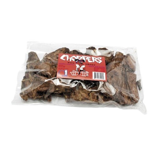 INGREDIENTS & GUARANTEED ANALYSIS Beef Lung. Crude Protein: 70% Min. Crude Fat: 10% Min. Crude Fiber: 3% Max. Moisture: 12% Max. ADDITIONAL DETAILS Calories: 3844 kcal/kg, 109 kcal per ounce Country of Origin: USA with Globally Sourced Ingredients Shelf Life: 24 months Unit Of Measure: oz Net Weight: 9oz (255g) Natural Beef Lung is our ONLY ingredient ; No Artificial Colors, Flavors, or Preservatives ; Single-Ingredient Treat ; No Wheat, Corn or Soy ; No Grains or Gluten ; Highly-Palatable ; FEEDING GUIDE Always monitor your pet while rewarding with a treat and give in limited quantity if your pet is not used to this treat. Do not allow your pet to swallow large pieces and discard any pieces that could be swallowed by your pet, as pieces could cause choking, gastric upset, or blockage. Chewing a hard treat could damage a pet’s teeth. Recommended treat size is slightly larger than your pet’s mouth. Rewarding on upholstery or carpeting is not recommended. Always provide a fresh supply of drinking water for your pet. Chomp, Chomp, Chomp Away A treat you won’t find anywhere else, Choppers ® are all-natural beef lung baked into a crunchy texture bursting with a meaty flavor. Our beef lung comes from trusted cattle ranchers, made in our company-owned and operated manufacturing facility in Great Bend, KS. But this protein packed treat doesn’t just taste like a meaty heaven, Choppers help support your dog’s overall dental health by gently scraping away plaque and massaging their gums as they chomp down. . .