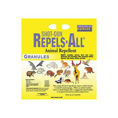 Deter the nuisances in your backyard from visiting you! Key Product Features Repels nuisance animals including skunks raccoons squirrels chipmunks and many more from gardens and planting areas Repels pests through smell taste and irritation of eyes and nose Safe for humans and pets when used as directed – you don t have to worry about curious children getting sick Granules water into the ground and last for up to 2 months Biodegradable – Repels-All granules are biodegradable and will not harm animals lawns gardens flowerbeds or other desirable plants when used as directed A convenient granular formulation of our popular Repels All liquid. Triggers genetically and biologically ingrained fear and flight responses in a multitude of animal intruders all without harm to the animals. It may be used around edibles and treats up to 1 500 square feet. This product will last up to 2 months protecting plants and property year-round. It is people and pet safe when used as directed. Let the pests know that you re garden isn t their dinner!