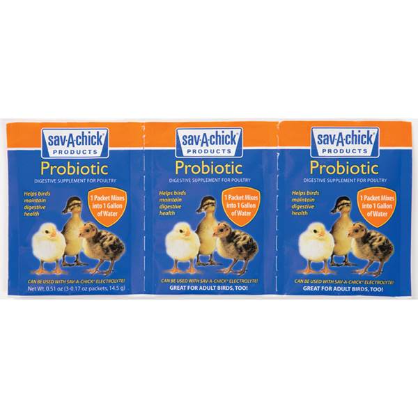 Designed for keepers of small flocks, each packet of Sav-A-Chick Probiotic Supplement conveniently mixes into 1 gallon of drinking water. The single-use packets are pre-measured to ensure accurate feeding, as well as product freshness. Formulated specifically for poultry, the balanced probiotic formula provides beneficial bacteria in the digestive tract to help the bird maintain a healthy digestive system. Use alone or with Sav-A-Chick Electrolyte and Vitamin Supplement. Quantity: 3 Pack.