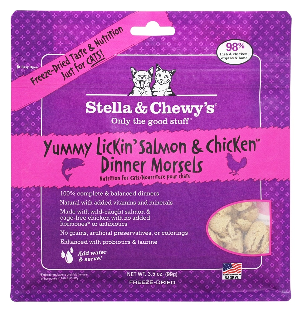 Stella & Chewy s Salmon & Chicken Dinner Morsels Grain-Free Freeze-Dried Dry Cat Food 3.5 oz Every pet parent wants wholesome natural nutrition for their pet. Stella & Chewy s raw diets focus on pure ingredients and raw protein so you can feed them as nature intended. At Stella & Chewy s we believe that pure raw nutrition fed in its natural state is the best way to help your pet thrive. Our limited ingredient recipes are simple and pure. Each batch starts with 90% or more meat organs and bone and is often a single source of animal protein the perfect solution for pets with food sensitivities.Each protein is grass-fed cage-free or wild caught to guarantee your pet is eating as nature intended. All of the produce in our recipes are 100% organic certified grown by farmers we trust. Our all-natural recipes are crafted with care in our own kitchen to provide the highest levels of protein rich meat and quality grain-free nutrition for your pet as if they were in the wild. In the Stella & Chewy s kitchen we take time to craft each recipe in small batches from the world s finest ingredients. All of our ingredients are sustainably sourced. Made without hormones or antibiotics and 100% organic-certified fruits and vegetables. Real raw nutrition in the convenience of freeze-dried patties; serve as is or rehydrate by adding water Formulated to mimic a canine s natural diet Complete and balanced nutrition is enhanced with probiotics to aid in healthy digestion Never contains grains gluten fillers artificial preservatives or colorings.