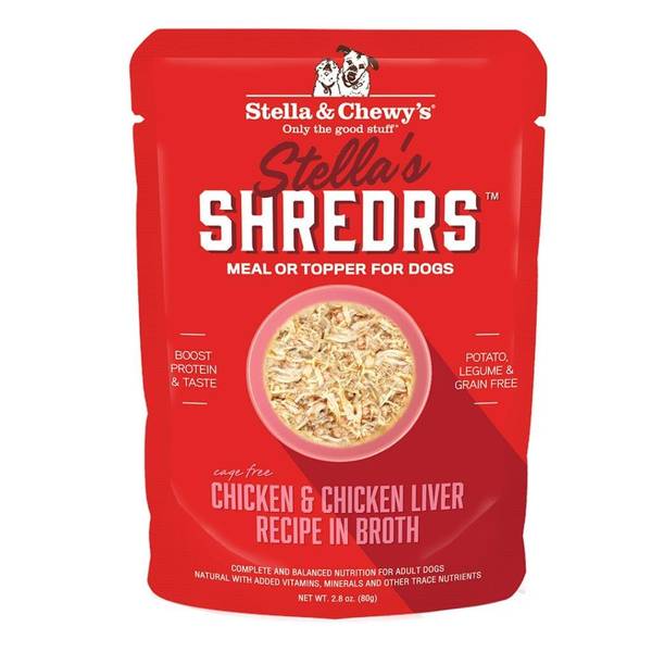 Feed your dog’s meaty cravings with new Stella & Chewy’s Shreds! This line of dog food is packed with all the moist meaty bites your pooch craves! It features real shredded muscle meat and diced meat in a slowly simmered broth, providing a boost of extra protein and taste that is great for picky pups. The proteins used in this dog food are responsibly sourced, ensuring the highest quality. Stella & Chewy’s Shreds are also boosted with vitamins and minerals to provide a complete and balanced meal or topper for your dog. Taurine is added to support overall heart health. This dog food is free from grains, legumes, potatoes, carrageenan, wheat, meat by-products, soy, artificial colors, preservatives, and flavors. Each pack contains 2.8 oz of delicious Stella Shreds Chicken and Liver in Broth Dog Food.
