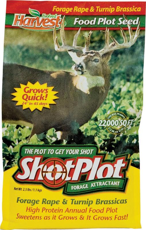 A premium mixture of Forage Brassicas that were developed to supplement & attract your deer herd. Forage brassicas are among the most palatable and nutritious annual forage that can be planted for deer. Shot Plot provides forage quickly by growing over 24 tall in about 45 days and once the Brassicas are mature deer will begin to devour them as well as the forage plants surge with growth to replace the devoured leaves. 2.5 lbs. plants 1/2 acre.