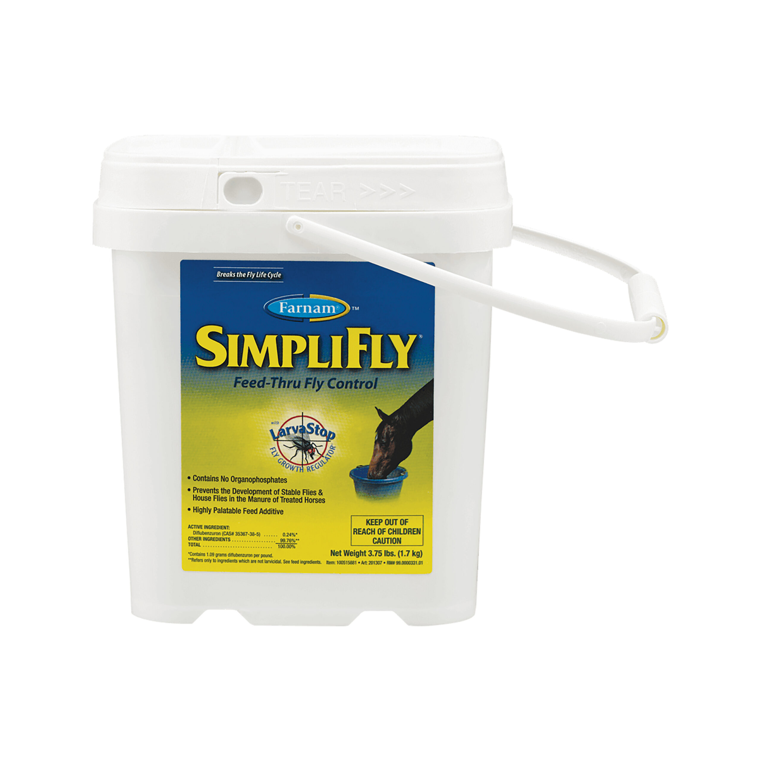 When flies are a menace in your stable it’s time to target them at their source – your horse’s manure. If not treated the manure from one horse has the potential to produce tens of thousands of flies in a single day. Introduce SimpliFly Feed-Thru Fly Control to your horse’s daily diet and suddenly you’re turning the favorite breeding grounds of stable and house flies into a No Fly Zone. When fed daily SimpliFly Feed-Thru Fly Control breaks the fly lifecycle by preventing fly larvae from developing in a horse’s manure. This fly growth regulator is made without organophosphates and will pass through your horse’s body unabsorbed. The feed will instead excrete the active ingredient diflubenzuron into their manure preventing it from being a viable breeding ground. This product can be effectively started anytime during fly season but for best results beginning daily feeding in early spring before fly season is optimal. SimpliFly Feed-Thru Fly Control is a highly palatable mixture that your horse will readily eat and easily mixes in with their daily feed. As part of an integrated pest management program you can see a significant decline in this season’s fly population. Keep your stable happy and target the fly problem at its source with SimpliFly Feed-Thru Fly Control. Bugs don’t fly with Farnam your partner in horse care.