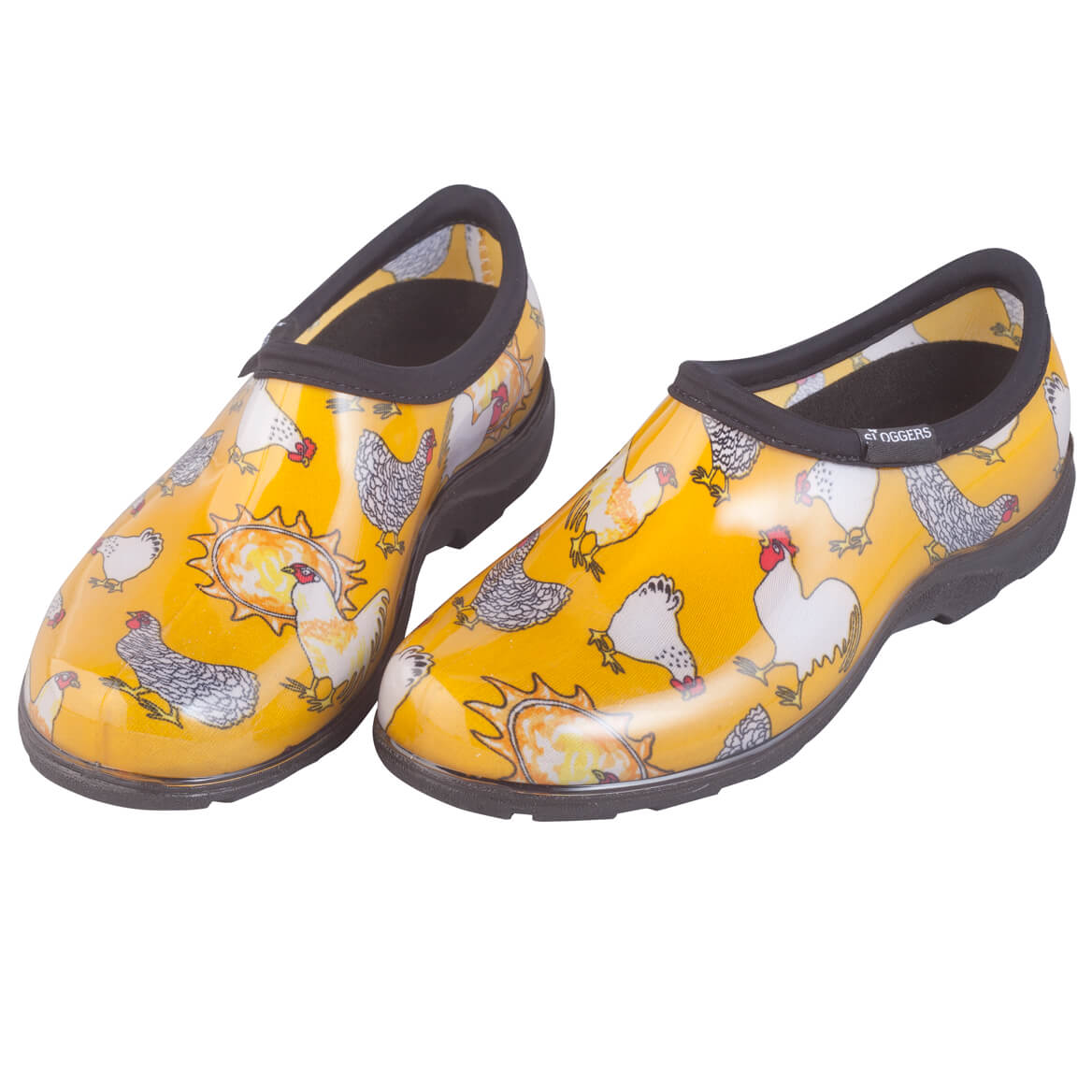 Slip into waterproof comfort with Sloggers fun variety of print rain and garden shoes. Features our All-Day-Comfort insoles for maximum comfort and our signature deep lug tread for great traction. Easy-on and easy to clean-up Sloggers are the perfect outdoor rain and garden shoe. Note: prints may vary slightly from shoe to shoe. Made in the USA from US and imported parts.