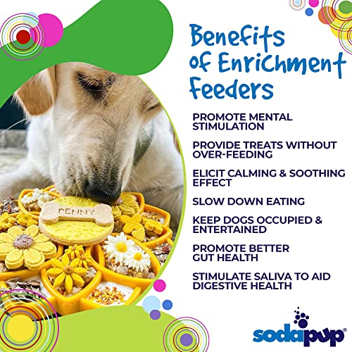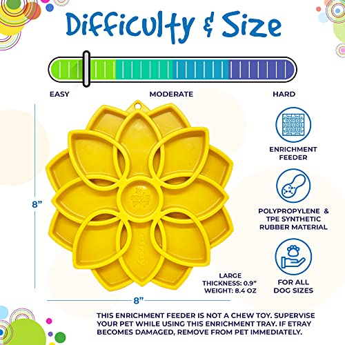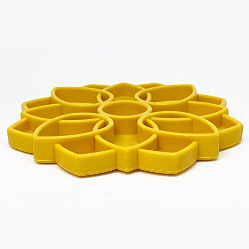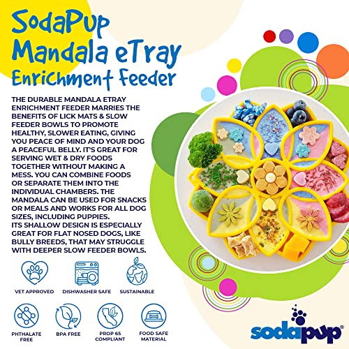 Meditate upon a better enrichment journey for you and your dog The Mandala eTray promotes healthy slower eating. giving you peace of mind and giving your dog a peaceful belly The Mandala eTray marries the benefits of lick mats with the benefits of slow feeder bowls Om ENRICHMENT: The Mandala eTray promotes slower eating and improves digestions Perfect for all size dogs including puppies BENEFITS The Mandala is perfect for serving wet and dry foods together without making a mess You can combine foods together or separate them in the individual chambers of the design The depth of the Mandala is ideal for serving raw meals (consult veterinarian) The Mandala can be used for snacks or for meals The Mandala design features different heights and depths imitating more natural eating conditions and putting your dogs natural foraging instincts to the test Ideal for flat nosed dogs like bully breeds that may struggle with deeper slow feeder bowls The Mandala design is a shallow slow feeder devise so it achieves slower eating without becoming impossible for some breeds to use Slower eating has the following benefits: calming and soothing for your dog. may help prevent bloat. improve digestion. better gut health. small meals last longer In addition. use of the Mandala etray may help keep your dog entertained. reduce separation anxietry. reduce boredom and unwanted behaviors associated with boredom TREAT SUGGESTIONS Peanut butter. canned pet food. cream cheese. yogurt (plain). pumpkin puree. crushed treat moistened with water. raw diets. and much more Consult your vet for a complete list of foods that are suitable for your pet WARNING: This is not a chew toy Supervise your pet while using this enrichment etray If etray becomes damaged. remove from pet immediately Care This Mandala etray is dishwasher safe on the top rack You can also wash in warm soapy water The Mandala is also freezer and microwave safe Size 8? wide X 8? tall. 09? thick Weight: 84 oz Country of Origin:- United States.