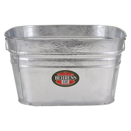 Behrens Funcational Decorative Hot Dipped Galvanized Square Wash Tub 15.5 Gallon. Square tubs are just what you need for many different occasions. Use for Monday s laundry your Saturday night bath for watering livestock as a planter or fill with ice and keep drinks frosty cold. Hot dipped galvanized. Two handles for lugging. 15-1/2 gallons. Top: 21 x 21 Bottom:16 3/4 x 16 3/4 11-1/2 deep. 6-1/2 lbs. Made in Mexico. As seen in Wine Spectator magazine.