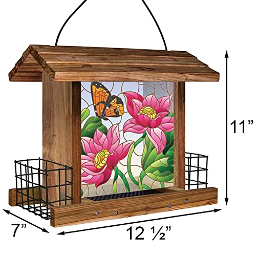Add a flair of stylish yet rustic elegance to your bird garden with this Nature s Way Stained Glass Hopper Feeder with Suet Cages. Expertly crafted with sturdy insect and rot resistant cedar this combination hopper and suet feeder is built to last and will keep your feathered friends full and happy for many seasons. Its pitched roof protects the sizable seed reservoir and overhangs the two suet cages keeping them dry in the elements. The two durable suet cages will easily withstand daily use and measure 4.75 wide 3 tall and 2.75 deep for standard suet or seed cakes. The reservoir holds up to 2.5 quarts of various types of seed and is comprised of two removable plastic panels each of which depicts a lovely image of a butterfly and flowers in a stained glass style. The roof lifts up allowing for quick and easy seed replenishment. This feeder accommodates large and small birds simultaneously and the rust-free feed tray features small drainage holes and is able to be removed for cleaning. The attached vinyl coated steel cable grants easy hanging and ideally the feeder should be hung roughly 10 feet from trees or shrubs to allow rest and refuge for feeding birds as well as for keeping it out of reach of squirrels. Enrich your garden and feed your bird friends with this gorgeous Stained Glass Hopper Feeder with Suet Cages. Birds that use this feeder: bluebirds cardinals chickadees finches flickers grackles grosbeaks jays juncos kinglets mockingbirds nuthatches orioles starlings tanagers titmice towhees warblers woodpeckers and wrens Seed or Feed Options: cracked corn mixed seed peanut chunks safflower seed suet sunflower kernels sunflower seed Capacity: 2.5 qts. 3.75 lbs.; 2 suet blocks Dimensions: 12.5 L x 7 W x 11 H Mounting: may be hung Construction: cedar plastic metal.