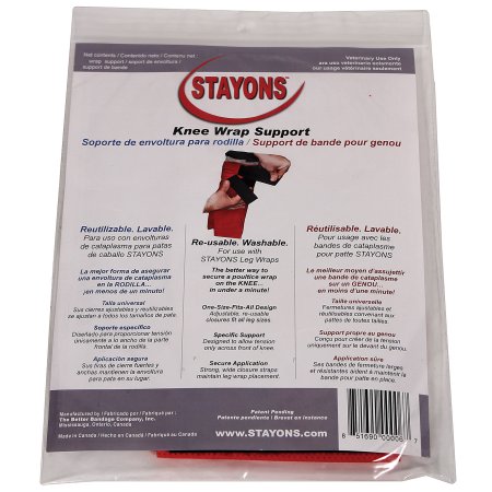 One size fits all design. Adjustable, re-usable closure fits all leg sizes. For use with stayons leg wraps. The better way to secure a poultice wrap on the knee, in under a minute. Designed to allow tension only across the front of the knee. Secure application. Strong, wide closure straps maintain leg wrap placement. Washable. .