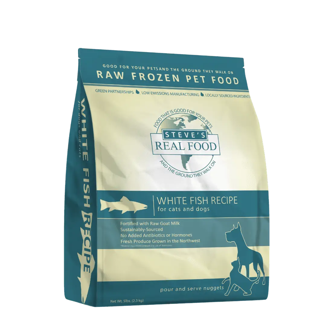 Steve’s Real Food diets are made with grass fed, grass-finished meats and poultry. With value-added ingredients like fortified raw goat milk, egg shell, and green lipped mussels and their ability to create a complete and balanced meals without the use synthetic vitamin packs, they’ve set themselves apart in the crowded raw feeding market. Steve’s fish is sustainably sourced from the Pacific Ocean. Like commercial-grade sushi, the whitefish is flash frozen at -40C to ensure parasites are eliminated. White Fish Recipe is naturally low in sodium and high in Omega 3’s, B6, B12, and selenium – making it good for heart health, cognitive function, and our senior pets. Biologically-appropriate formulation composed of 80% meat/organ/bone, 15% produce, and 5% value-added ingredients. Provides your pet everything they need without the use of synthetic vitamin packs. Appropriate for all stages of life and can be fed to both dogs and cats (great for multi-pet households).