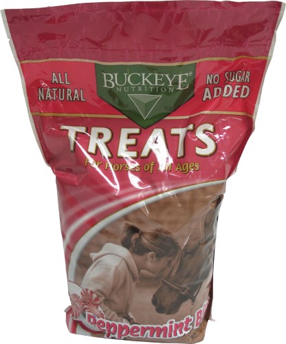 Buckeye® Nutrition Treats – all–natural handy disc-shaped treats are highly digestible tasty healthy rewards for horses of all ages. Plus theres no sugar added! Feeding directions: up to 1/2 lb daily per horse. Not intended to replace normal grain or hay ration. Resealable bags. Apple Snaps are made with real apples! Carrot Crunchers are made with real carrots! Both flavors contain min 12% crude protein min 5% crude fat max 10% crude fiber calcium phosphorous copper selenium and zinc. Peppermint Bits are made with natural peppermint oil. Contain min 12% crude protein min 3.5% crude fat max 5% crude fiber calcium phosphorous copper selenium and zinc.