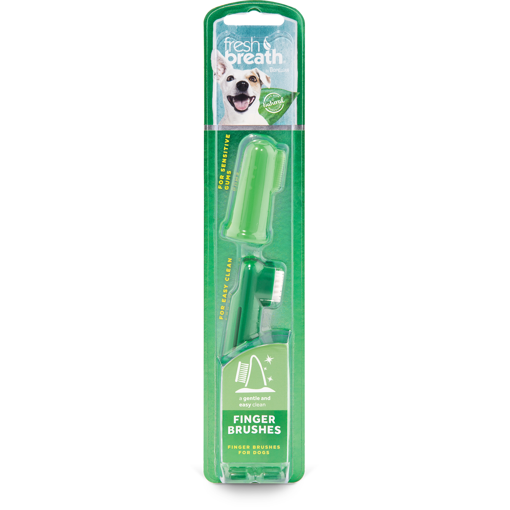 TropiClean Fresh Breath Dental Finger Brushes for Pets allow you to easily and safely clean your pet’s teeth. The TropiClean Fresh Breath Finger Brush and Gentle Finger Brush is made out of a soft flexible silicone for a more gentle and natural brushing experience. Gentle natural clean. Great option for puppies – helps develop brushing acceptance. VOHC and NASC accepted. Proudly made in the U.S.A. For use on both dogs and cats. Directions For Use Brush teeth once daily. Depending on your dog’s preference, us the TripleFlex Brush or the Finger Brush. Squeeze a small amount of Brushing Gel for Dogs onto the brush and allow your dog to taste. Reapply and gently brush in a circular motion. Use in combination with TropiClean Fresh Breath Clean Teeth Oral Care Gel, Dental Health Solution, and Dental Chews or Dental Sticks for maximum oral care protection. Safety Information For animal use only. For dogs and cats 12 weeks old and over. Keep out of reach of children and pets. Store at or near room temperature for best product performance. Store in a closed container. Never use human toothpaste, which can upset your pet’s stomach. | TropiClean Fresh Breath Dental Finger Brushes for Pets | Dental Chews | For Dogs/Cats.