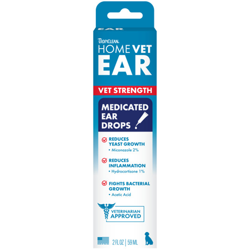 TropiClean HomeVet Medicated Dog Ear Drops deliver fast, soothing relief from ear irritation, odor, and infection. This vet-strength formula combines miconazole to treat fungal infections, hydrocortisone to reduce itching and inflammation, and acetic acid to control odor and inhibit bacteria growth. Gentle, alcohol-free, and sting-free, this medicated dog ear drops is safe for sensitive ears while restoring comfort and promoting ear health. Ideal for use after baths or swimming to help prevent infections. Benefits:. Rapid Relief – Calms itching, redness, and discomfort caused by fungus, bacteria, or yeast. Powerful, Vet-Approved Formula – Miconazole, hydrocortisone, and acetic acid work together for maximum effectiveness on dog’s ears. Gentle & Hypoallergenic – Alcohol-free, sting-free dog ear care that’s safe for routine use. Prevents Future Issues – Great for post-bath or swim care to help keep dog ears healthy. Trusted Quality – Made in the USA, cruelty free, and backed by 40+ years of pet care innovation.