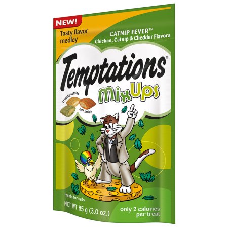 Did your fussy feline greet you with a chorus of purrs when you got home? Reward your cat with a mix-n-match of their favorite playtime cat treats. Temptations MixUps Catnip Fever is a trifecta of tempting treats with a mix of chicken catnip and cheese flavors. Each of these tasty cat treats has less than 2 calories and provides an irresistible combination of both crunchy and soft textures. They re excellent-sized treats for cat toys so try placing a few inside a treat dispenser toy and watch your furball chase and swat away. Temptations MixUps comes in a resealable pouch so your fur-friend can enjoy their favorite cat treats when you open it… but not when they shouldn’t! Temptations MixUps are the purr-fect crunchy and soft cat snack to show your feline friend how much you care.