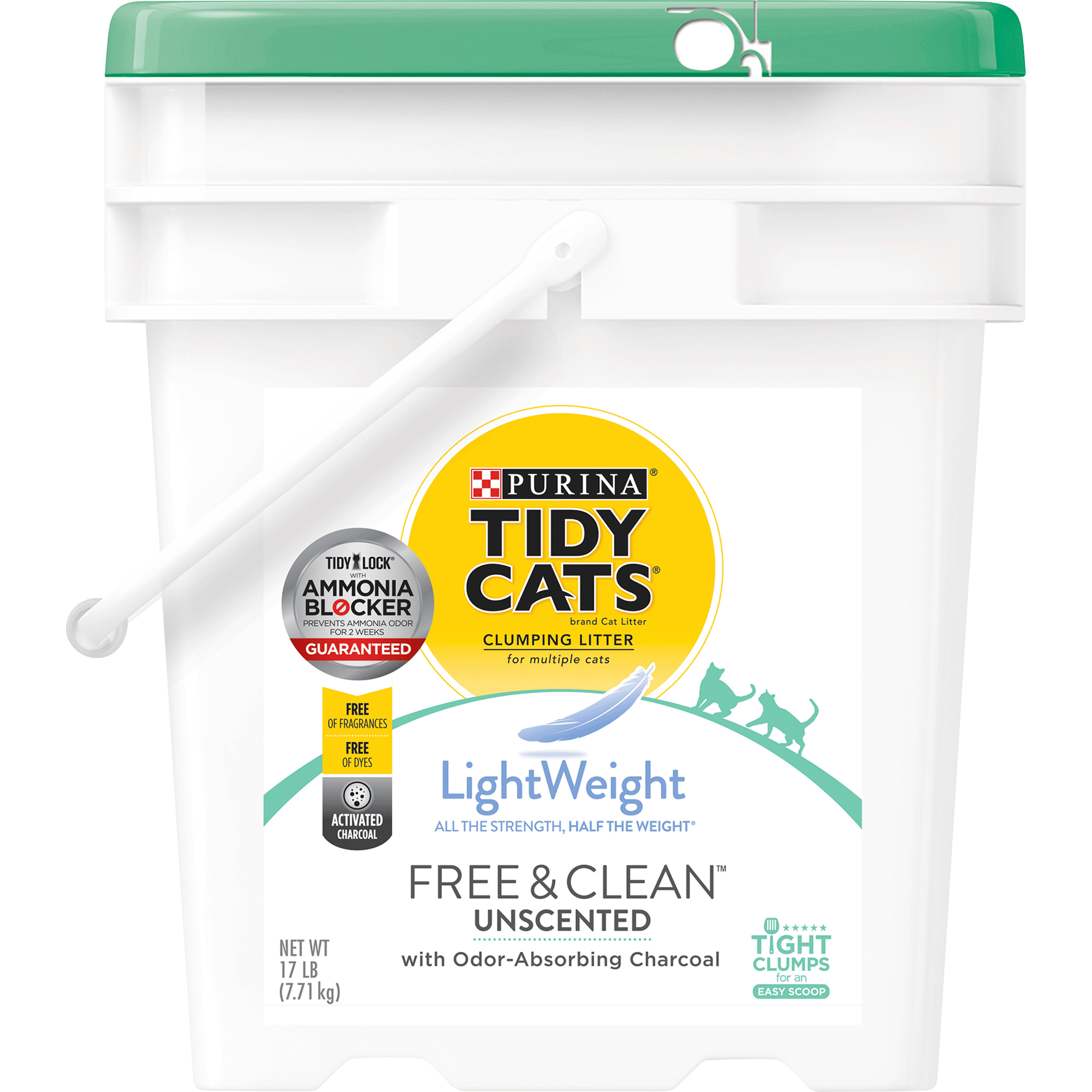 Purina Tidy Cats Clumping Litter Free And Clean Unscented Count on Purina Tidy Cats LightWeight Free Clean Unscented With Ammonia Blocker clumping litter to help you win the war against odor while maintaining freshness for your cat. With the same great formula you know and love and the same performance you expect along with a new look this low-dust litter pours cleanly and easily into your cats litter boxes. This unscented formula is free from fragrances and dyes and the odor control cat litter helps lock in moisture keeping your cats comfortable. Activated charcoal absorbs odors on contact while an Ammonia Blocker prevents ammonia odor from forming for 14 days when used as directed helping you maintain a fresh-smelling and welcoming home.