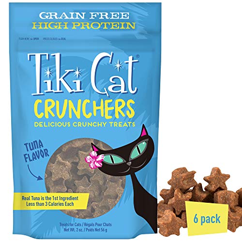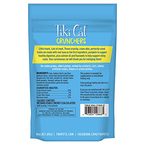 Tiki Cat Crunchers cat treats are grain-free, perfectly-sized, meaty treats for your carnivorous cat. A high protein, low calorie delicious crunchy treatSalmon oil and flaxseed to help promote shiny coatsNo grains, added gluten, animal by-products corn, wheatNo artificial colors, flavors, or preservativesWith pumpkin to aid in digestion.. Features Perfect blend of freshness and nutrition for your beloved furry friends; Case of 6; Ingredients Tuna, tapioca starch, pea flour, garbanzo beans, turkey meal (preserved with mixed tocopherols), fish meal, chicken fat, chicken flavor, dried pumpkin, flaxseed, salmon oil, mixed tocopherols (preservative), green tea extract, rosemary extract.; Specifications Flavor: Tuna & Pumpkin; Capacity: 2 oz.