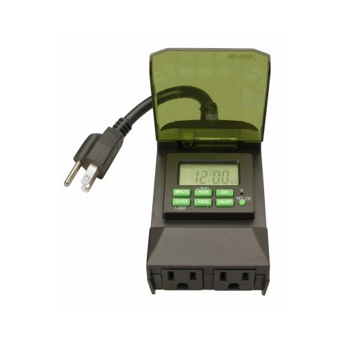 The Outdoor 7-Day Digital Outlet Timer allows you to improve the energy efficiency of your home. With this timer, you can set automatic timers for your outdoor electronics and appliances, so you don’t have to run outside to turn them on or off. Automates landscape lights, flood lights, seasonal decorations, and fountains to simplify outdoor living. Up to 20 on/off settings per day, repeats weekly. Option to program each day different or weekdays different than weekends with countdown, random, & daylight savings features. Large digital display and convenient manual override button. Color: Multi-Colored.