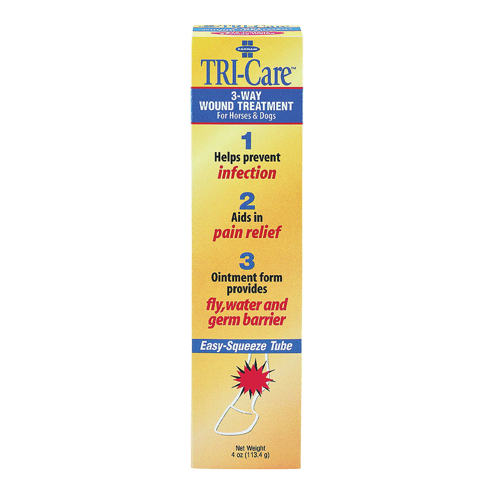 Three-way wound treatment for horses and dogs. Antiseptic properties help prevent infection. Contains benzocaine to aid in pain relief. Creates a barrier against flies, germs and water to allow wounds to heal properly. Also contains emu oil and tea tree oil to help promote healing. Easy squeeze tube keeps product clean and free of dirt.