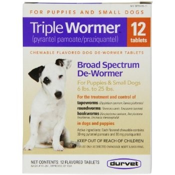 Durvet Triple Wormer 7 way dog puppy De-wormer Pyrantel Pamote Praziquantel Triple Wormer® is for the treatment and control of roundworms (Toxocara canis Toxascaris leonina) hookworms (Ancylostoma caninum Ancylostoma braziliense Uncinaria stenocephala) and tapeworms (Dipylidium caninum Taenia pisiformis) in dogs and puppies. – Available without a prescription – The broadest-spectrum de-wormer available OTC – Easy and convenient chewable tablets – Treats and controls seven strains of tape hook and roundworms For dogs and puppies weighing 6 to 25 lbs: 6.0 to 12.0 lbs give 1 Puppy/Small Dog(30mg) tablet 12.1 to 25.0 lbs give 2 Puppy/Small Dog(30mg) tablets For dogs weighing more than 25 lbs: 25.1 to 50.0lbs give 1 Medium/Large Dog(114mg) tablet 50.1 to 100.0 lbs give 2 Medium/Large Dog(114mg) tablets 100.1 to 150.0 lbs give 3 Medium/Large Dog(114mg) tablets 150.1 to 200.0 lbs give 4 Medium/Large Dog(114mg) tablets Offer the proper dosage by hand or in the dog s food container with or without food. Do not withhold food from your dog prior to or after treatment. Consult your veterinarian for assistance in the diagnosis treatment and control of parasitism.