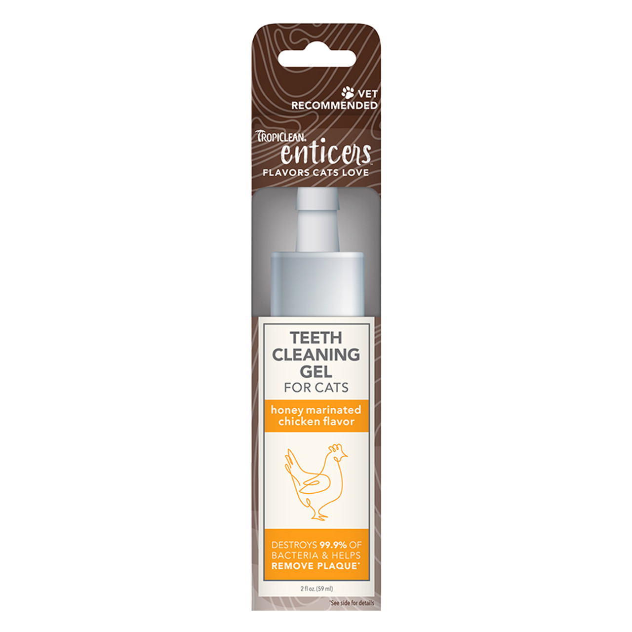 TEETH CLEANING GEL FOR CATS – HONEY MARINATED CHICKEN FLAVOR Say hello to your cat’s new favorite delicacy. TropiClean Enticers Teeth Cleaning Gel is a savory oral care solution with a honey marinated chicken flavor that will have your cat meowing for more teeth cleaning goodness. Gel is made with naturally derived ing.