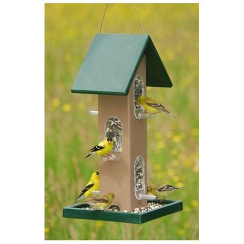 Holds 4 quarts of seed with easy to fill through roof.; Windows pop out for easy cleaning.; The tube feeder is easy to clean and disinfect.;.