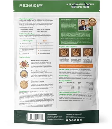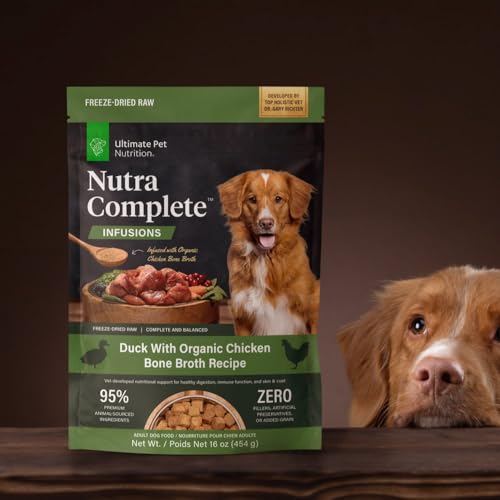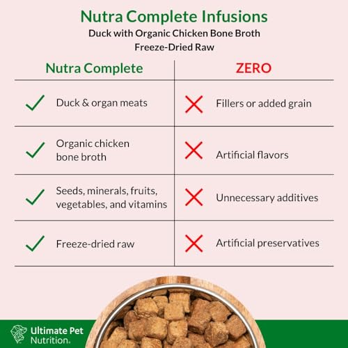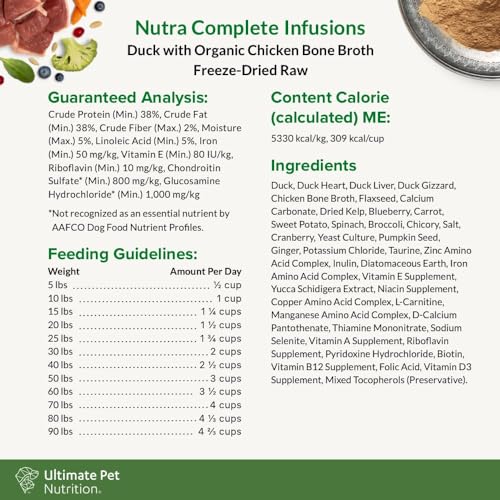 Nutra Complete™ Infusions: Duck With Organic Chicken Bone Broth Adult Dog Food is a complete and balanced veterinarian-developed blend of protein-packed duck seeds minerals fruits vegetables and vitamins — freeze-dried raw for maximum nutrition and flavor. Every delicious bite has been infused with powdered chicken bone broth for a burst of powerful nutrients like glucosamine and chondroitin to help your dog stay active and happy. Nutra Complete™ Infusions contains over 40 hand-selected ingredients that align with your dog’s natural diet and help support healthy digestion a thick coat healthy immune function and overall health and happiness.