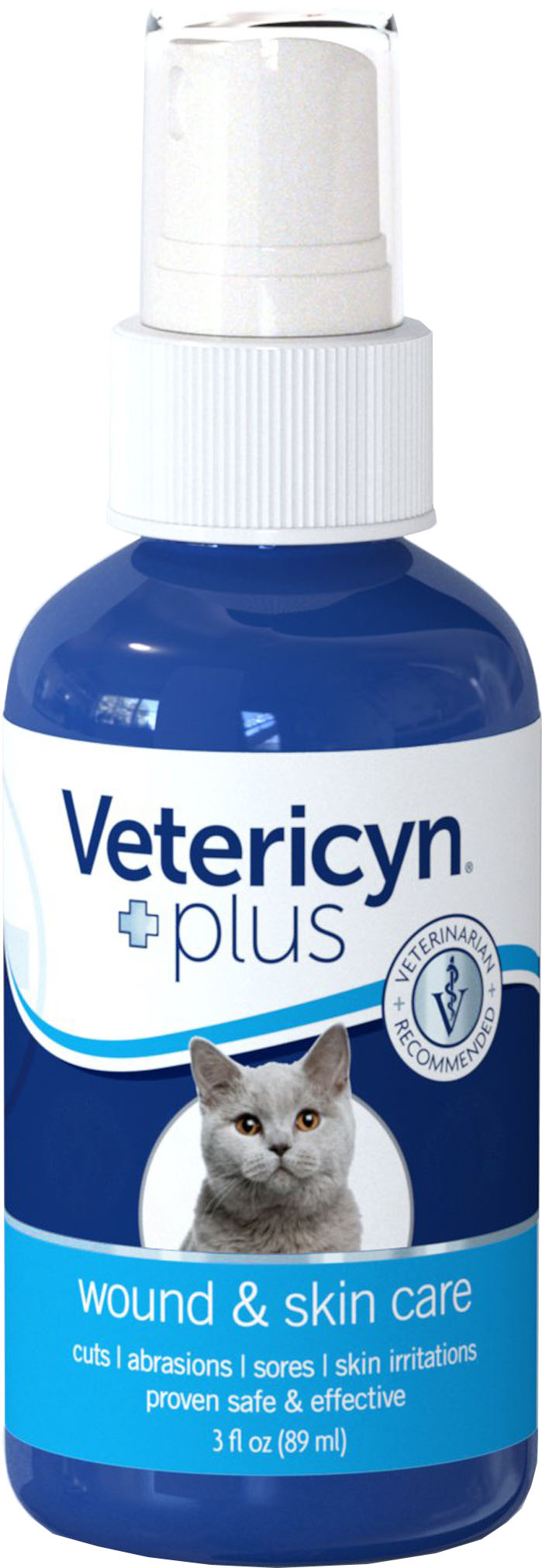 If your cat is injured or in pain use Vetericyn Plus Feline Wound Care Spray to kickstart healing and prevent infection. It is ideal for cleaning your cat s wounds such as cuts scratches rashes hot spots and post-surgical sites. This healing spray flushes debris from the damaged skin and relieves irritations. Saturate dressings or apply directly to the affected area a few times daily to provide soothing comfort and prevent infection.
