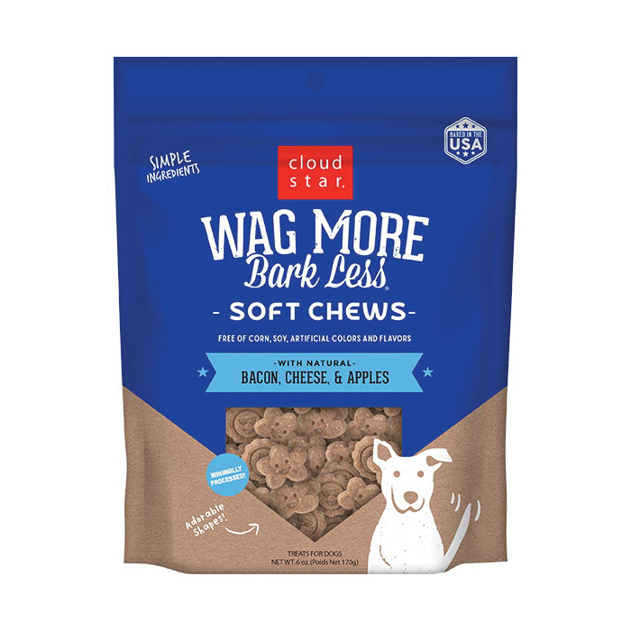 Cloud Star Wag More Bark Less uses just a few simple ingredients in their Soft and Chewy with Bacon, Cheese and Apples Dog Treats so you can treat your pup to the very best. These soft, all-natural bites feature fun smiling star, sun and cloud shapes and are made without corn, soy, white potatoes or by-products, so you can indulge your furry superstar and feel good about it. They?re all-natural and minimally processed with wholesome apples and a tantalizing smoky bacon and cheddar flavor that will keep your dog?s tail wagging. So go ahead and reward him with this delicious, guilt-free snack inspired by a love for dogs.