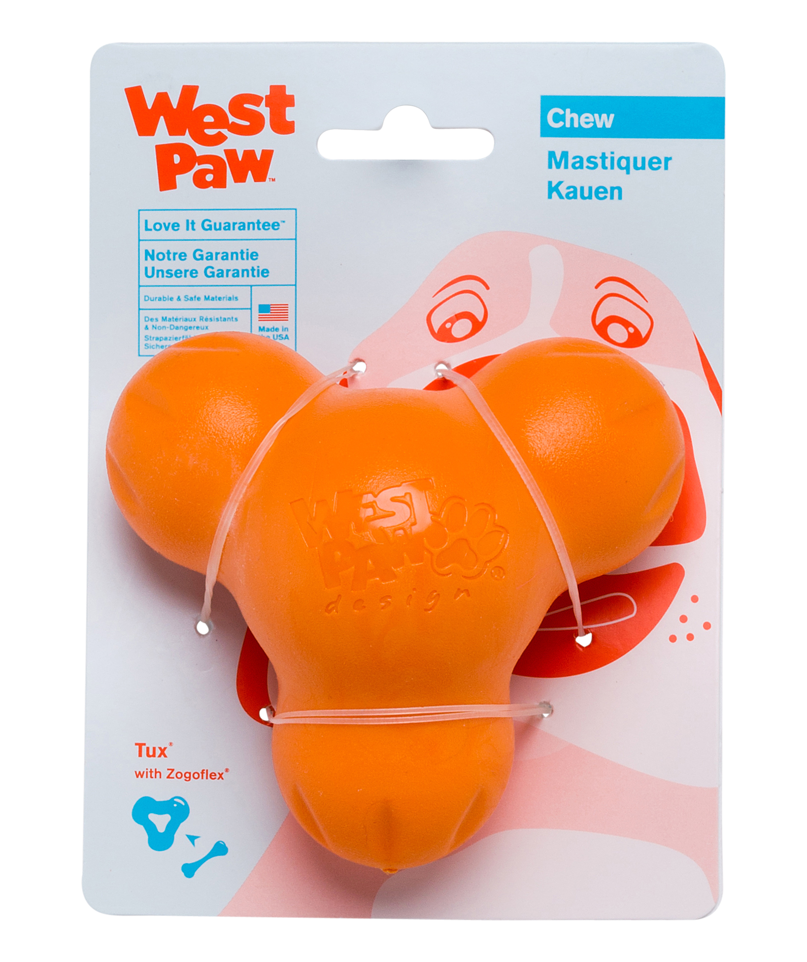 The toughest treat toy Tux is made to stand up to some fearsome fangs. Nut butters biscuits and meaty bits all get gnawed free whenever a dog is near. Create a Tux-cicle to keep dogs cool in hot months. Simply fill with broth gravy or wet food and freeze. Tux is also fun to toss fetch and chew even after the treats are gone.