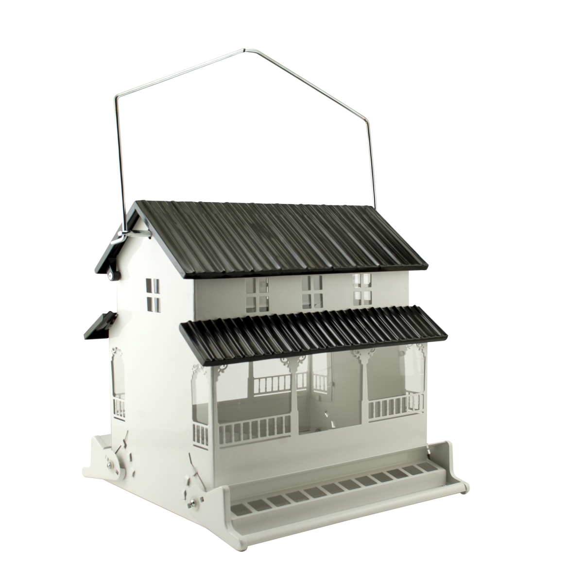 Prepare your backyard for flocks of wild birds. With the Heritage Farms Hanging Mount Backyard Farmhouse Squirrel Resistant Bird Feeder get your backyard feeling like an aviary and celebrate your neighborhood s birds. Don t skimp on capacity when feeding nature s finest. With this hanging ranch-style feeding trough bird feeder support multiple birds and fill your feeder with up to 10.5 quarts of safflower seeds or peanuts splits. No matter which friendly faces pass through your outdoor spaces this bird feeder is made to accommodate. This feeder is constructed of white steel frames designed in a 2-level farmhouse with black roofs clear windows porch rails and column shapes. If squirrels or larger animals rest on these perches the metal lid protects the seed openings and stops them from reaching the feed. This bird feeder has a powder-coated finish to protect this feeder from elemental wear. To clean or refill this bird feed you can simply remove the roof for access. Give the local birds a reason to visit your backyard and find a great seat to watch them eat with the Heritage Farms Hanging Mount Backyard Farmhouse Squirrel Resistant Bird Feeder.