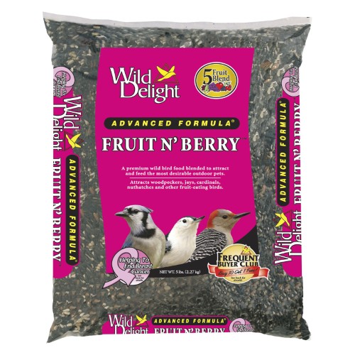 WILD DELIGHT FRUIT & BERRY WILD BIRD FOODWild delight advanced formula fruit & berry wild bird food contains added real fruit and berries. A premium wild bird food blended to attract and feed the most desirable outdoor pets. Attracts woodpeckers, jays, cardinals, nuthatches and other fruit-eating birds. Use with hopper feeders, tube feeders (with large holes) or platform feeders. UPC: 719195365053 Size: 5 POUND Product Type: Wild Bird Food – Wild Bird Food / Wild Bird Seed Mixes-general.