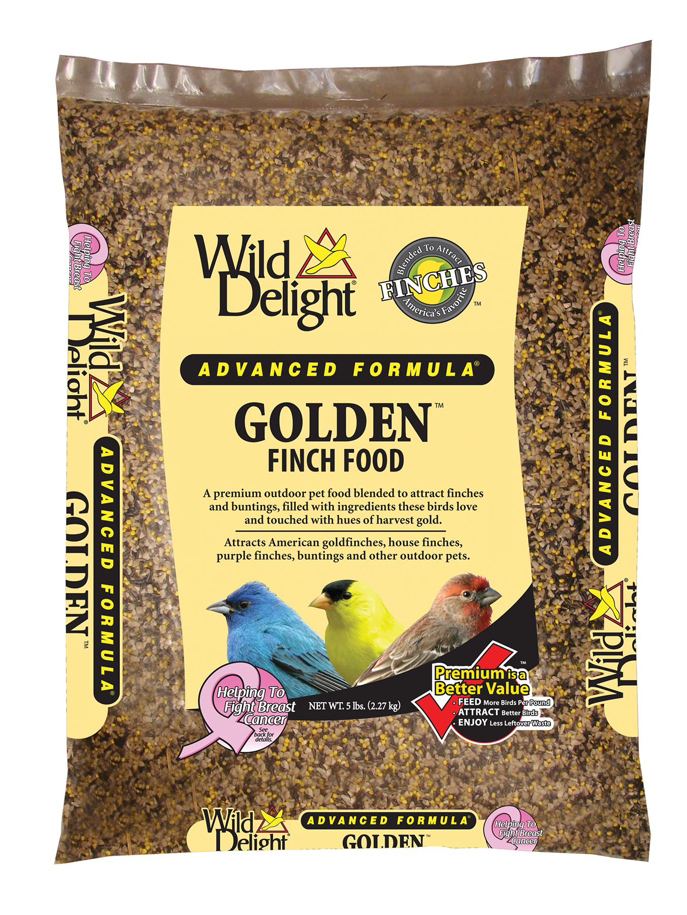 Wild Delight Advanced Formula 373050 5 lb Golden Finch Food is a premium outdoor pet food blended to attract finches and buntings filled with ingredients these birds love and touched with hues of harvest gold.