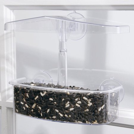 The Droll Yankees Observer Window Feeder feeds all types of birds. It has a suction cup design so that you can attach it to any window. A cover protects the seeds from the elements while drainage holes keeps the contents dry.