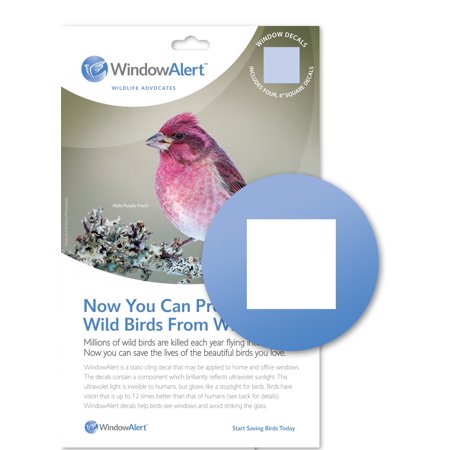 WindowAlert decals help prevent wild birds from accidentaly striking windows. Each decal has a special coating that reflects ultraviolet sunlight. This ultraviolet light is invisible to humans but birds see it as a brilliant glow – much like a stoplight. To the human eye the decals appear as frosted or etched glass. Our new Modern Square decal is popular with owners of modern homes where steel and glass are the predominate building materials. And as well in commercial and institutional settings where the decal is complimentary to those particular architectural styles. Window Alert decals may be used only on an exterior glass surface – free of any overlay tinting film or coating. Clean glass first with water. Avoid use of chemicals such as ammonia or window cleaners. Decals are best applied when glass is warm (ideally greater than 50 degrees). If applied during winter months clean glass with warm water prior to application. Place decals alone or in groups every few feet on the outside of the window. Position out of reach of infants and small children. Restore static cling by rinsing in lukewarm water. UV coating may fade based on exposure and local elevation. Replace decals every 9 to 12 months.- SKU: GC8658.