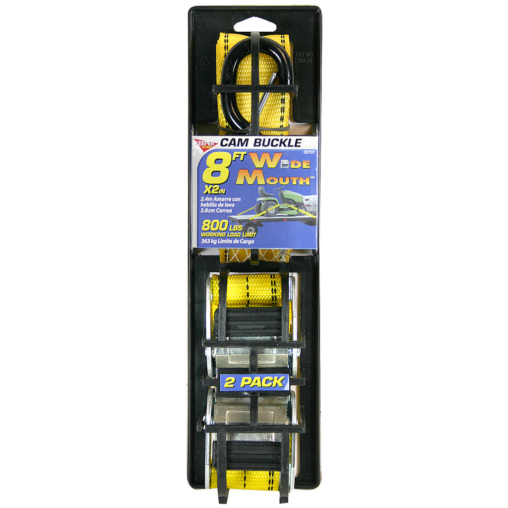 The Keeper 8 ft. Cam Buckle Tie-Down features a durable, 2 in. Hi-Test webbing and steel cam buckle with teeth grip for a tight and secure hold. The vinyl-coated S-hook with latch can be affixed to rings, hooks, anchors, D-Rings andother cargo anchors. It is ideal for securing small loads and equipments.