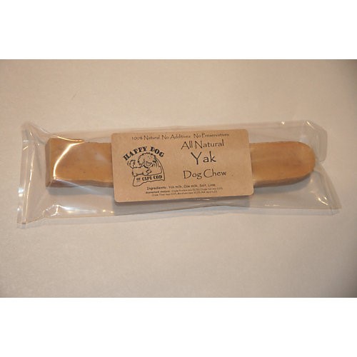 Happy Dog of Cape Cod Yak Chew The Happy Dog Of Cape Cod Yak Chew is a 100% all natural way to treat your dog. It is a hard chew that is incredibly durable while still being safe for your dog. Your dog must work the end of the chew for hours, softening it with his or her mouth before small pieces of it can be slowly scraped off. There are no additives or preservatives, so you can feel great about giving it to your best friend. Features: 100% natural Long-lasting Safe for all dogs No additives or preservatives Item Specifications: Size: Extra Large: 5-6 oz. Please note: this is an all natural product and sizing will vary. Guaranteed Analysis: Crude Protein (min.): 52.8% Crude Fat (min.).9% Moisture (max.): 10.2% Ash (max.): 6% Ingredients: Yak Milk, Cow Milk, Salt, Lime.