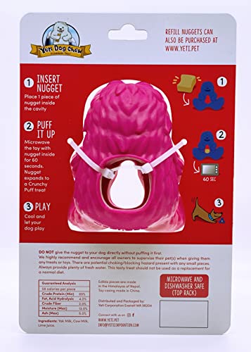 DOG TOY THAT KEEPS THEM INTERESTED IN CHEWING: With the help of Yeti Puff and Play Toy it increases the intellectual stimulation of your pet as your dog works to get the chew out. It keeps chews stable and easily accessible for your dog’s chewing enjoyment. Paw-fect accessory for dogs Teething Behavior Training and Anxiety Calming. Long-lasting interactive treat dispensing chew toy! MICROWAFE AND DISHWASHER SAFE: Yeti Puff And Play Toy is microwave and dishwasher safe and works well with all natural Yeti Nuggets. It is easy to clean and easy to use for your dog s daily use. WIDE VARIETY OF COLORS: It comes in three different colors: Pink Green and Blue. Just choose your desired color then let your dog satisfy their love of chewing! HOW TO ENJOY THE PUFF AND PLAY TOY: Insert 1 piece of nugget inside the cavity. Microwave the toy with nugget inside for 60 seconds. The nugget will puff up to twice its size and fill the entirety of the cavity. Let it cool and let your dog enjoy the crunchy treat! Refill Yeti Nuggets are shaped and sized specifically to fit the Puff and Play Toys and are sold separately. Yeti Nuggets are available in 6 15 30 and 50 piece refills. Do Not give the nugget to your dog directly without puffing it first.