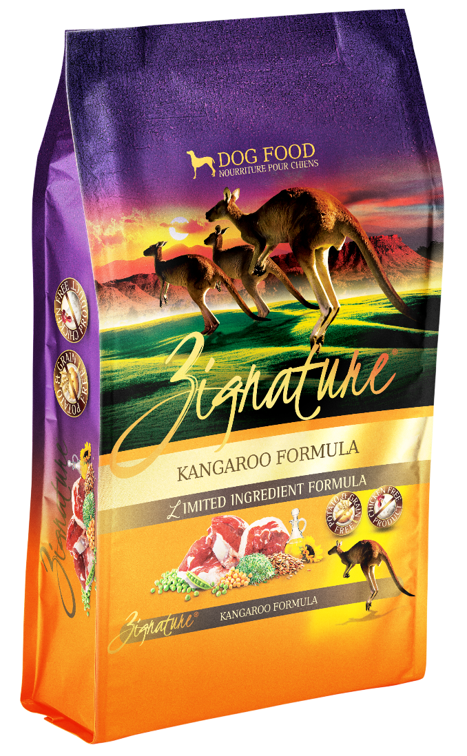 Zignature Grain-Free Kangaroo Formula Dry Dog Food Zignature Limited Ingredient Formula Grain-Free Kangaroo Formula Dry Dog Food is made with Kangaroo meat from Australia. Kangaroo is a great source of protein and has very little saturated fat. It is rich in B vitamins Iron Omega-3 Fatty Acids and Conjugated Linoleic Acid (CLA). The added fruits and vegetables supply antioxidants and fiber to aid in digestion. Suitable for all stages. Ingredients: Kangaroo Kangaroo Meal Peas Chickpeas Pea Flour Sunflower Oil (Preserved with Citric Acid) Flaxseed Dehydrated Alfalfa Meal Pea Protein Natural Flavors Calcium Carbonate Salt Choline Chloride Minerals (Zinc Proteinate Iron Proteinate Copper Proteinate Manganese Proteinate Cobalt Proteinate) Potassium Chloride Vitamins (Vitamin A Acetate Vitamin D3 Supplement Vitamin E Supplement Niacin D-Calcium Pantothenate Thiamine Mononitrate Pyridoxine Hydrochloride Riboflavin Supplement Folic Acid Biotin Vitamin B12 Supplement) Lactic Acid Calcium Iodate Sodium Selenite Preserved with Mixed Tocopherols. Guaranteed Analysis: CRUDE PROTEIN 26.0% min CRUDE FAT 14.0% min CRUDE FIBER 4.5% max MOISTURE 10.0% max OMEGA 3 FATTY ACIDS 0.6% min OMEGA 6 FATTY ACIDS 3.0% min.